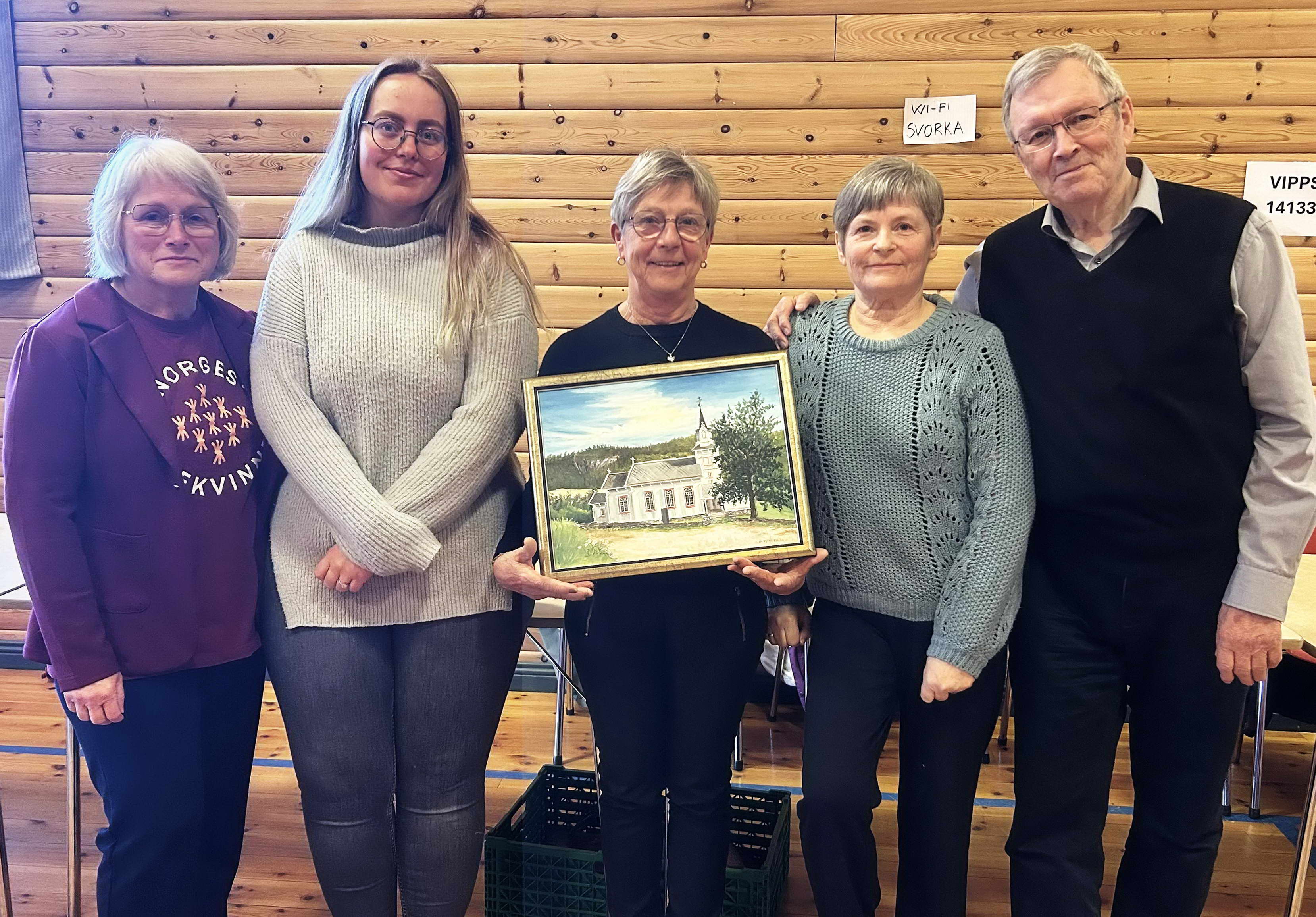Av dei rundt 80 gevinstane var måleriet av kyrkja særleg attraktivt, merka desse i komiteen: Gunda Bele (frå venstre), Gro Marit Hakstad, Eva Jorid Svendsen, Grete Ingunn Krogstadnes og Bernt Bøe. Foto Mali Settem.