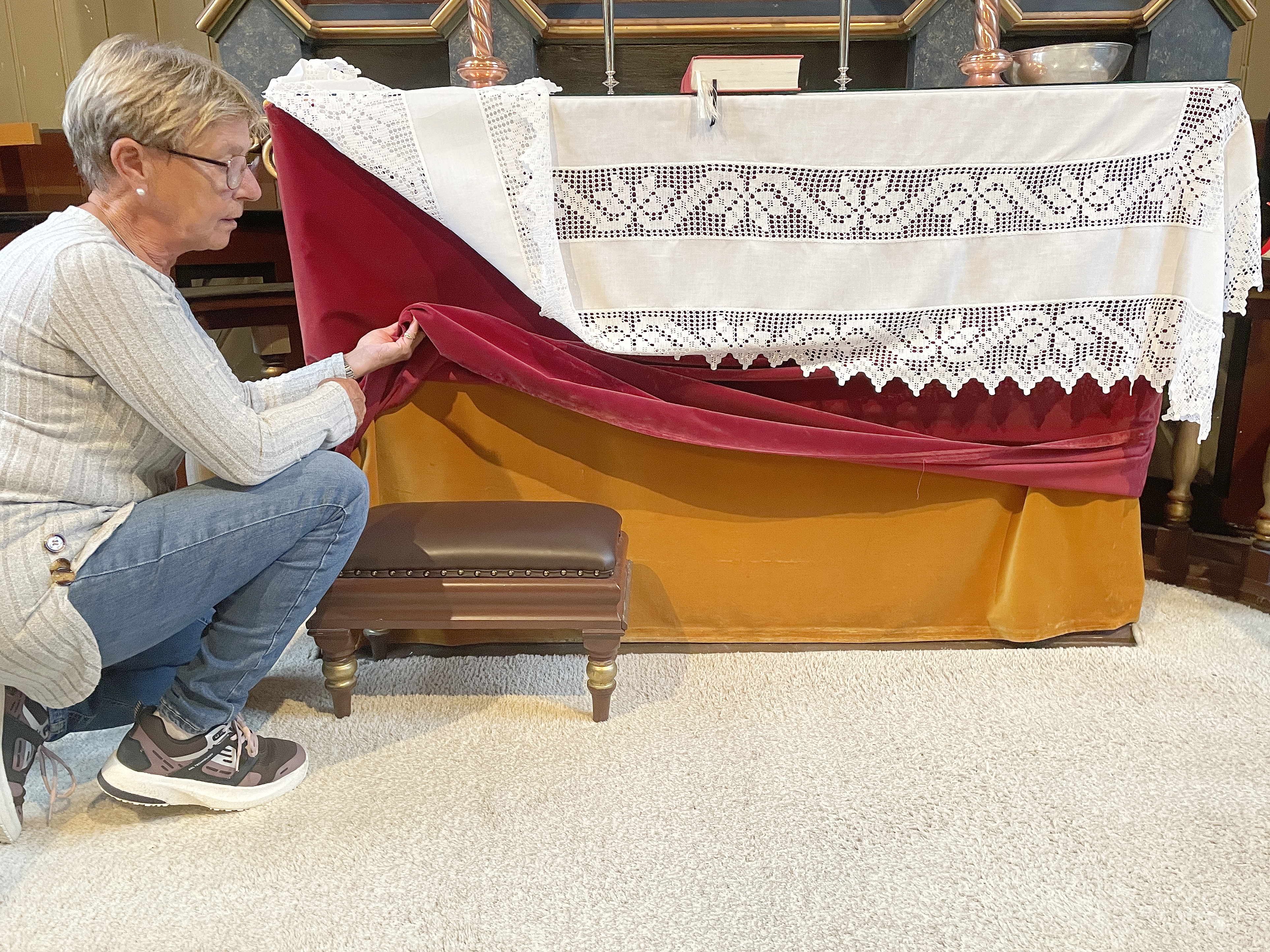 Framside: Eit eldre, gult forheng dukka fram under det noverande. – Kven hugsar dette? undrast soknerådsleiar Eva. Foto Bernt Bøe
