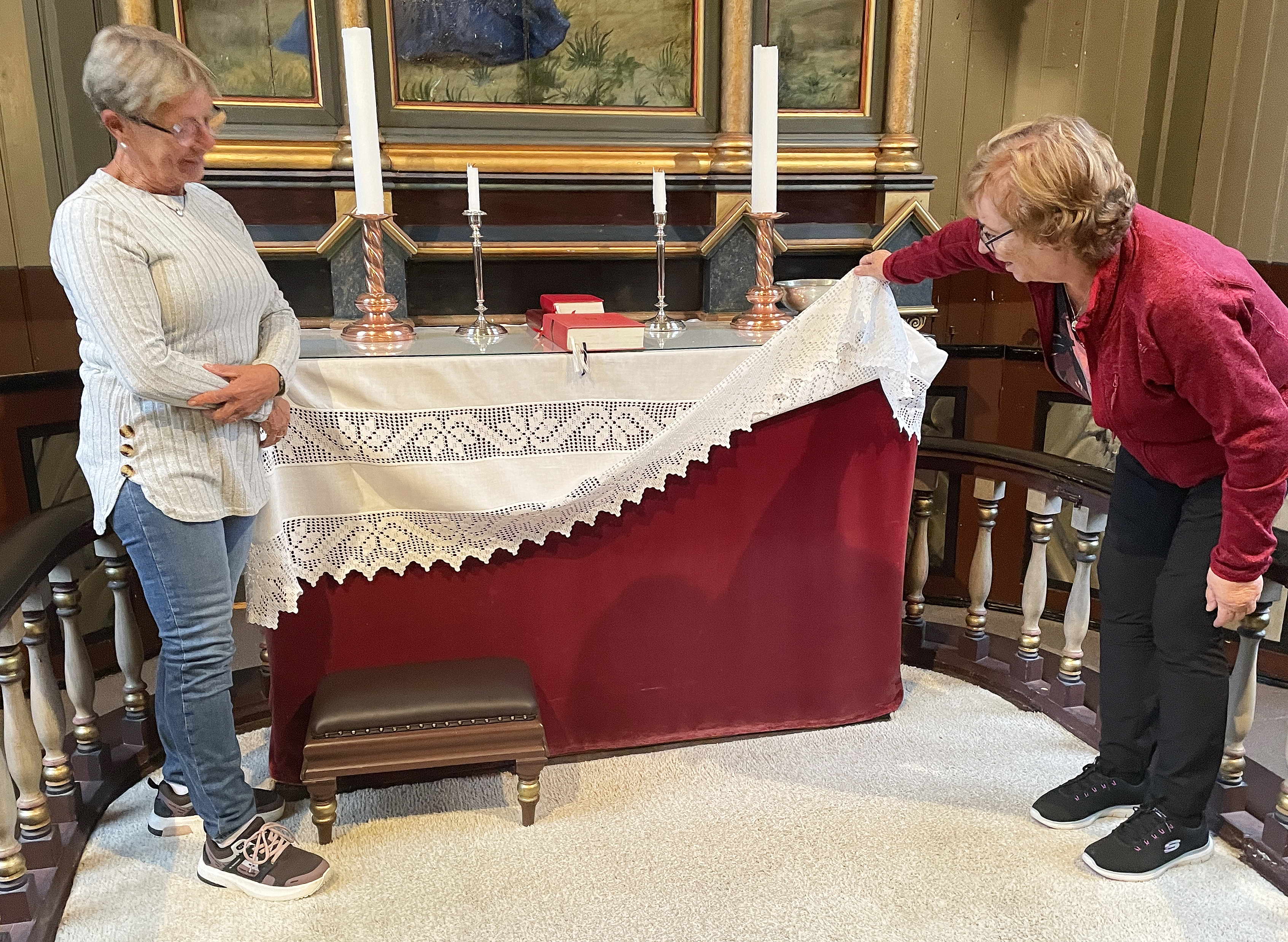 Det noverande raude antependiet er slite og falma, konstaterer Eva Jorid Svendsen (t.v.) og Jane Nordstrand Svensli i Åsskard sokneråd. Foto Bernt Bøe