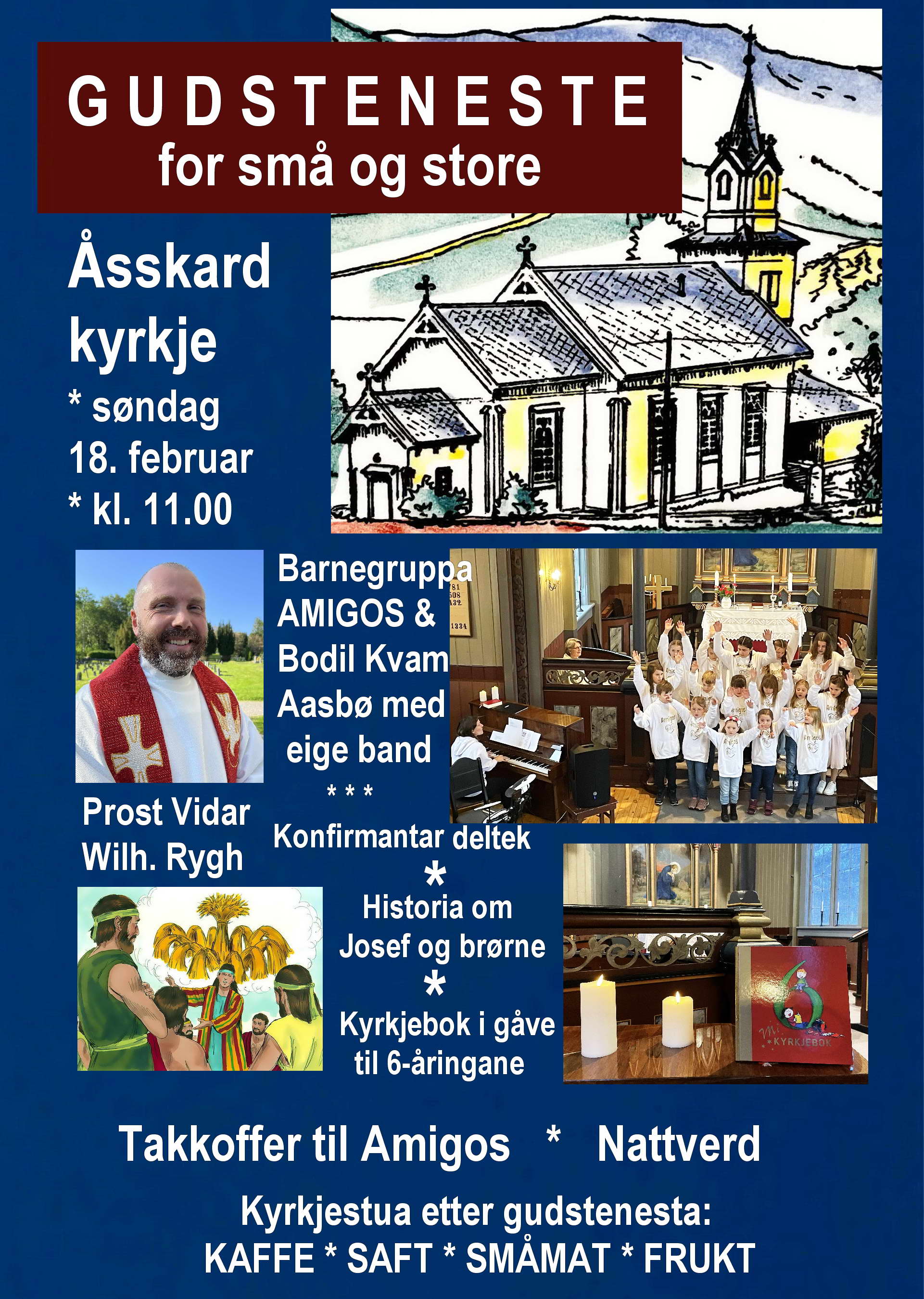 Der vil Amigos bidra med song. Og dei eldste ungane dannar musikkband til nokre av songane! Alle som hugsar Amigos-gudstenesta i fjor, veit at dette er noko å glede seg til. Også denne gong vil takkofferet gå til dette store barnearbeidet.